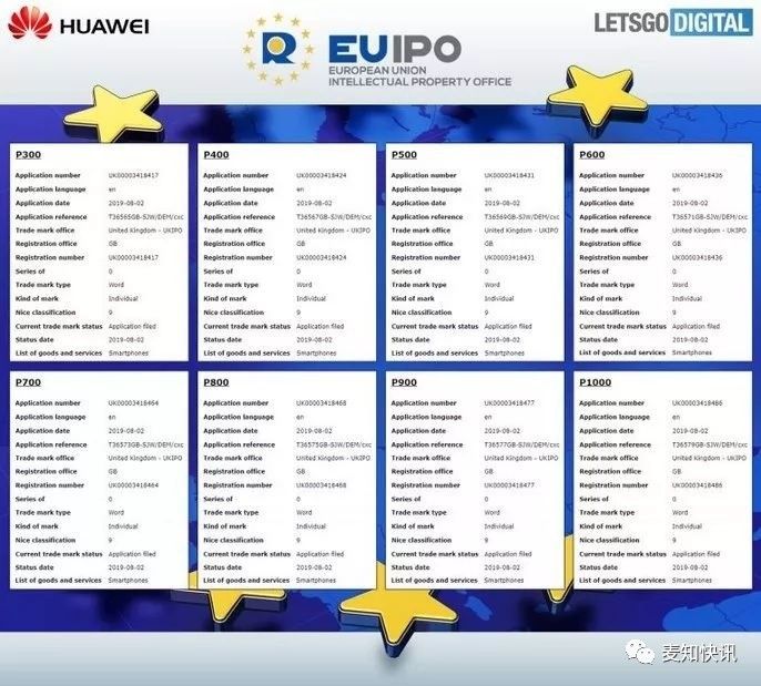 加入了这几款商标后,华为在欧洲申请的商标就从P300开始一直延续到P1000。而这也使得之前对于华为这番动作的猜测,都变得更加无法确定。